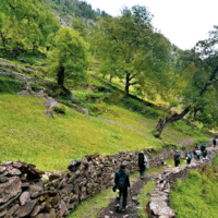 Trek down through forests, orchards, and charming villages to reach Barua.
